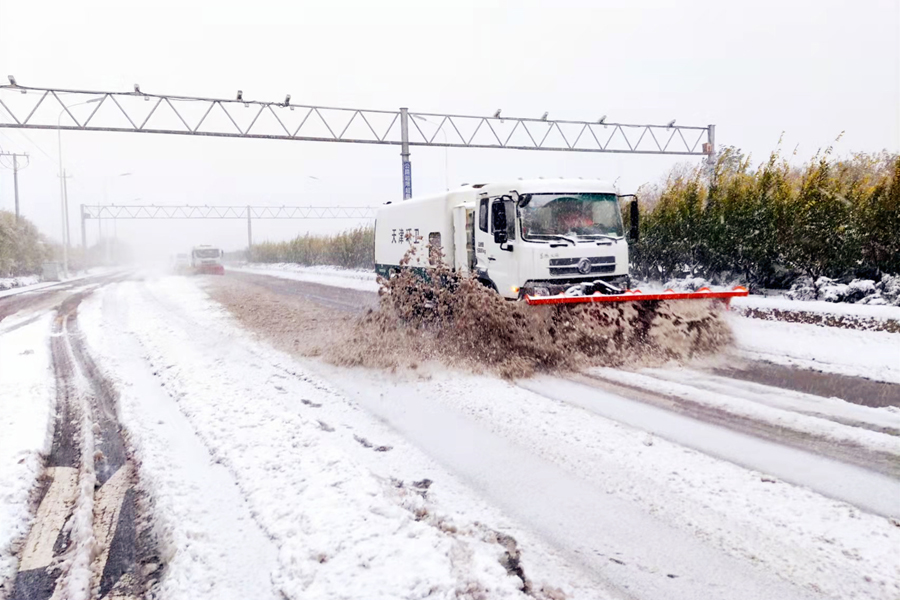 天津海晶輕紡環衛公司在清雪過程中,共出動清雪人員94人,灑水車15輛,雪鏟7輛,其他專業車輛20輛,噴灑融雪鹵水90車次、1300立方米,第一時間打通主干道路,有效地保障了天津濱海新區道路交通順暢和市民出行安全;