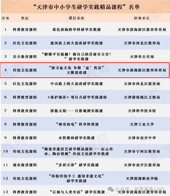 日前,天津市教育兩委公布了一批天津市中小學(xué)生研學(xué)實(shí)踐資源,公司組織申報(bào)的《探尋鹽文化 爭(zhēng)做“鹽”究員》傳統(tǒng)文化課程成功入選“天津市中小學(xué)生研學(xué)實(shí)踐精品課程”名單。