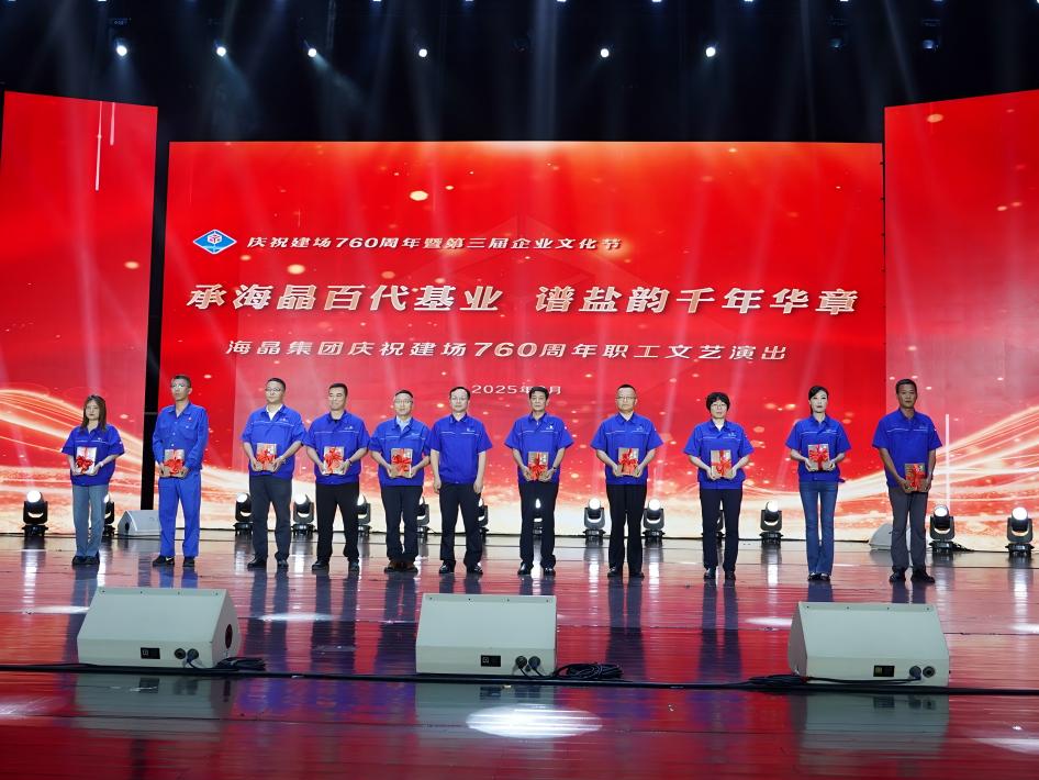 在公司迎來建場760周年的歷史性時刻,由公司黨委精心策劃并組織編撰的《鹽韻春秋》正式出版發(fā)行。此書是公司黨委深入挖掘千年鹽場文化底蘊、賡續(xù)奮斗精神的一項重要文化工程,旨在通過系統(tǒng)梳理公司波瀾壯闊的發(fā)展史詩,激勵全體海晶人鑒往知來,凝聚起邁向新征程的磅礴力量。《鹽韻春秋》是向公司建場760周年獻上的一份厚禮。9月24日,在公司慶祝建場760周年職工文藝演出上舉行了授書儀式,公司黨委書記、董事長李煥嶺為公司勞模、先進工作者等代表授書。