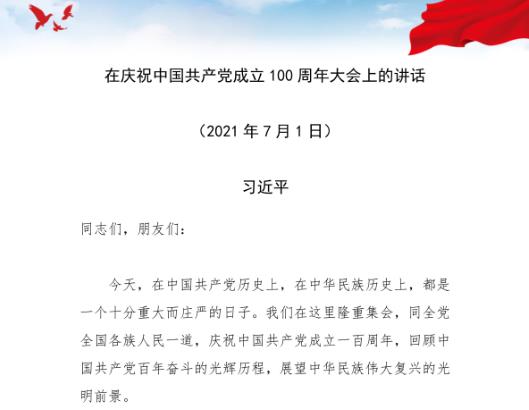習近平在慶祝中國共產黨成立100周年大會上的講話